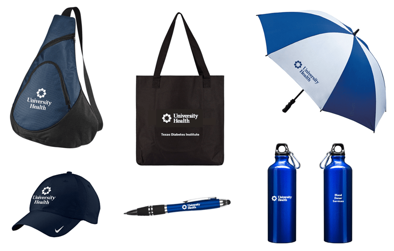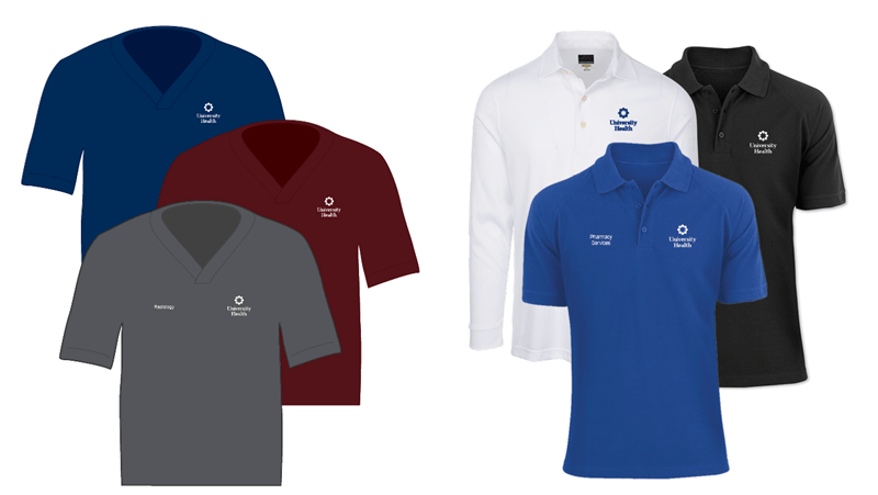 Use the masterbrand logo. Listing or including a sub-entity is acceptable on clothing but should be separated from the masterbrand logo. The department or sub-entity name should use Arial Regular font, and recommended size is 0.27"h. The shirt color should follow University Health uniform standards. Only approved vendors should be used. Corporate Communications & Marketing must approve final proof.